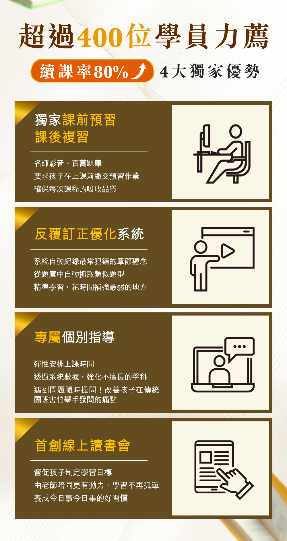 三優創新高效學習法,讓進步立竿見影!針對客製化課程帶領學生排定學習課表,踏踏實實按照課表學習,成績進步沒問題。