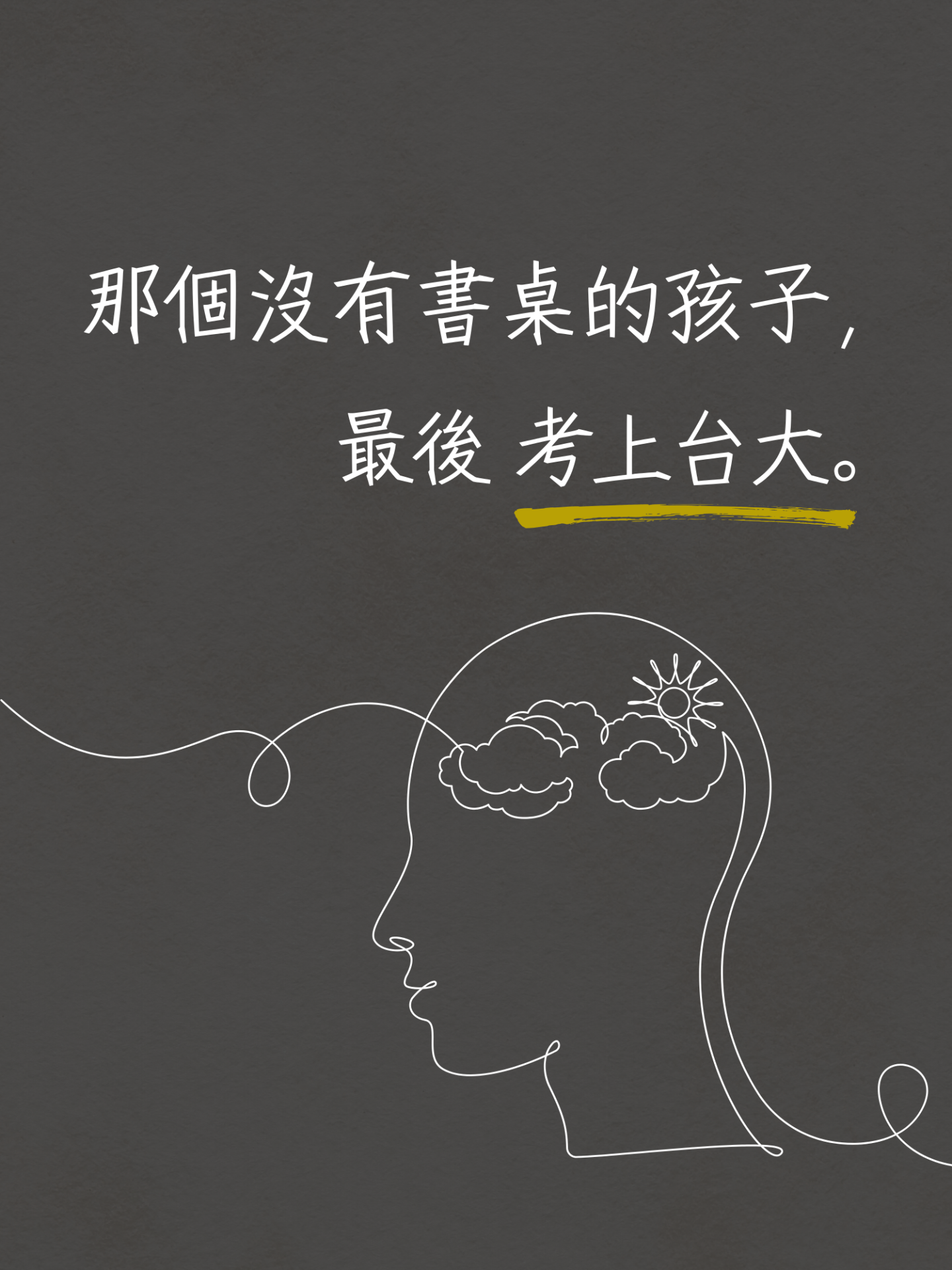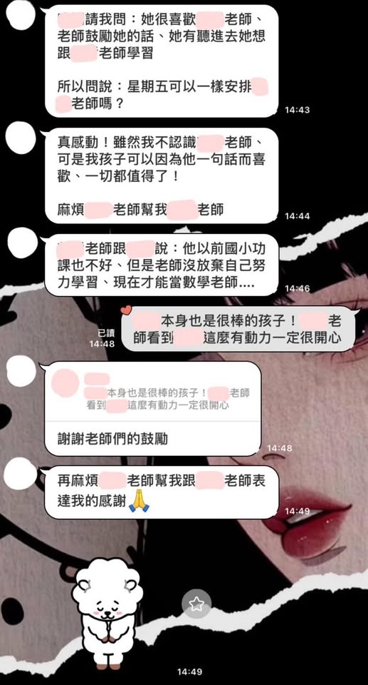 我彷彿看到小時候的自己,爸爸是清潔員,媽媽是餐廳的洗碗工,不要說上補習班了,下課後要跟同學去學校旁的雜貨店買一排可樂軟糖都是奢侈,後來一步一腳印的靠自己艱難的走到今天,不知不覺如今也播種了好多莘莘學子。當時有時他會心情低迷,想要放棄的時候,我總會告訴他:「你可以放棄,但未來的你,會為今天的放棄感到遺憾。」